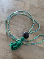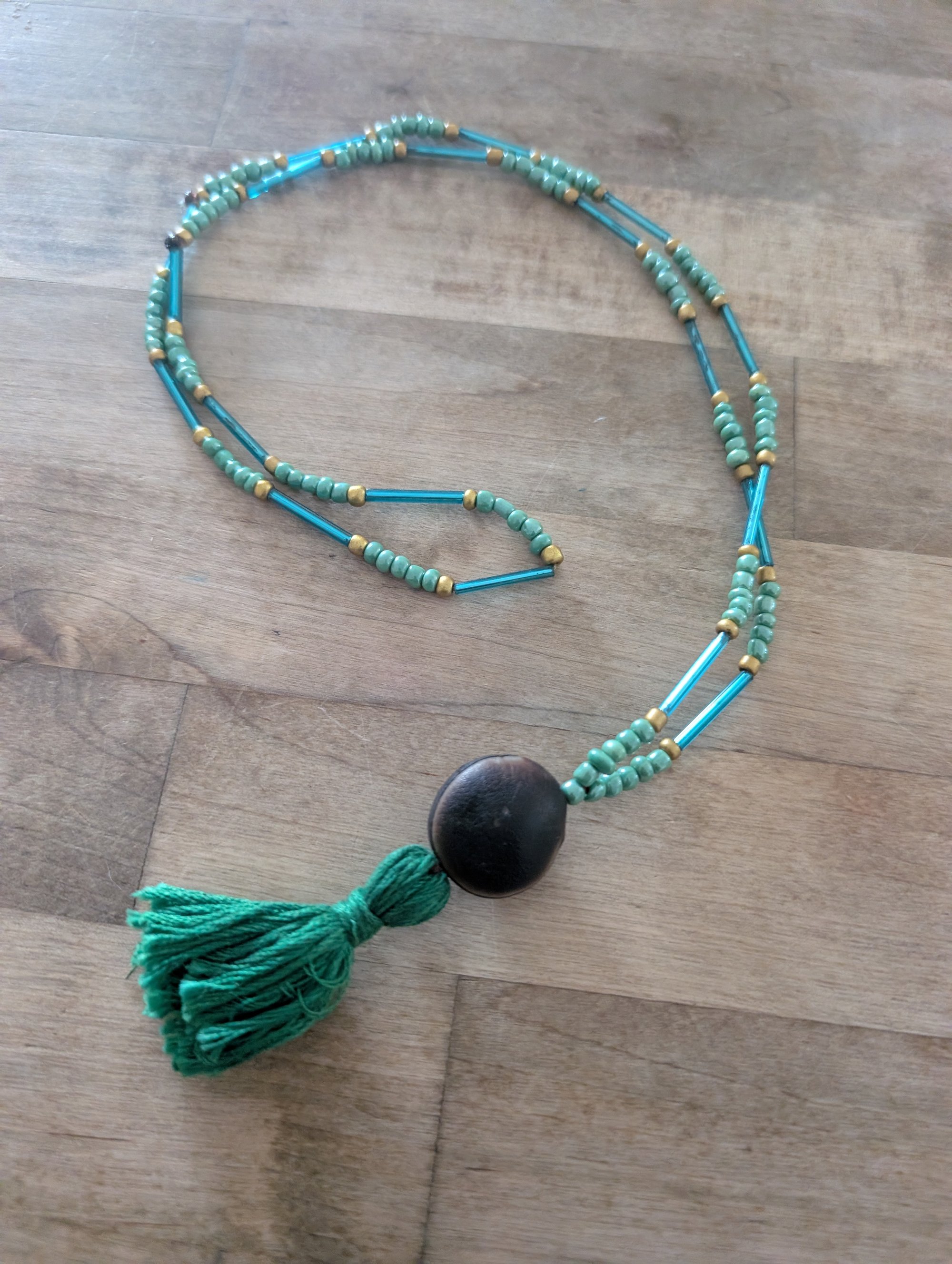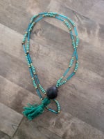 Hunter Green tassel with shimmer green and gold beads. Blue Glass tube accents. 16" inseam length.