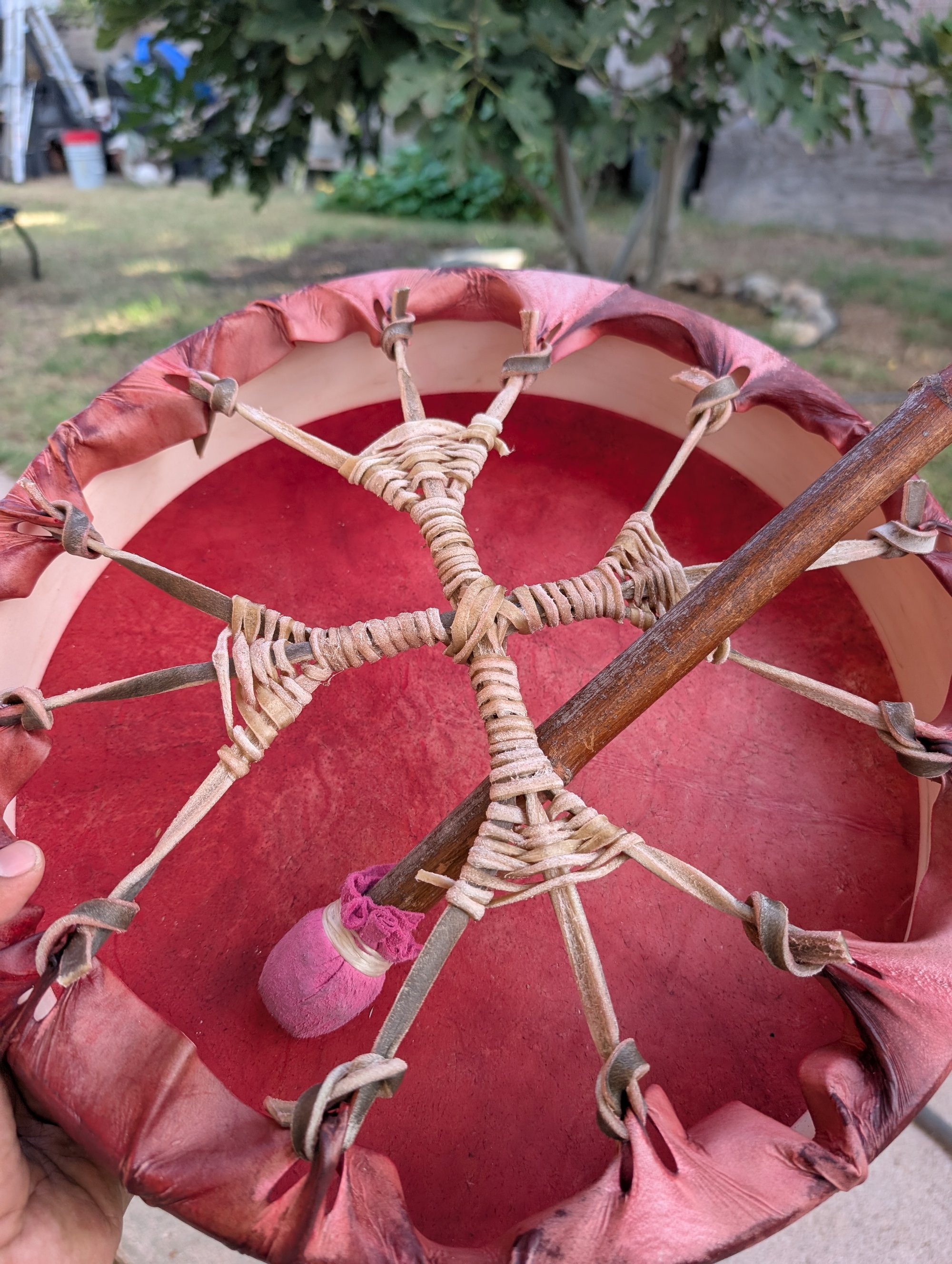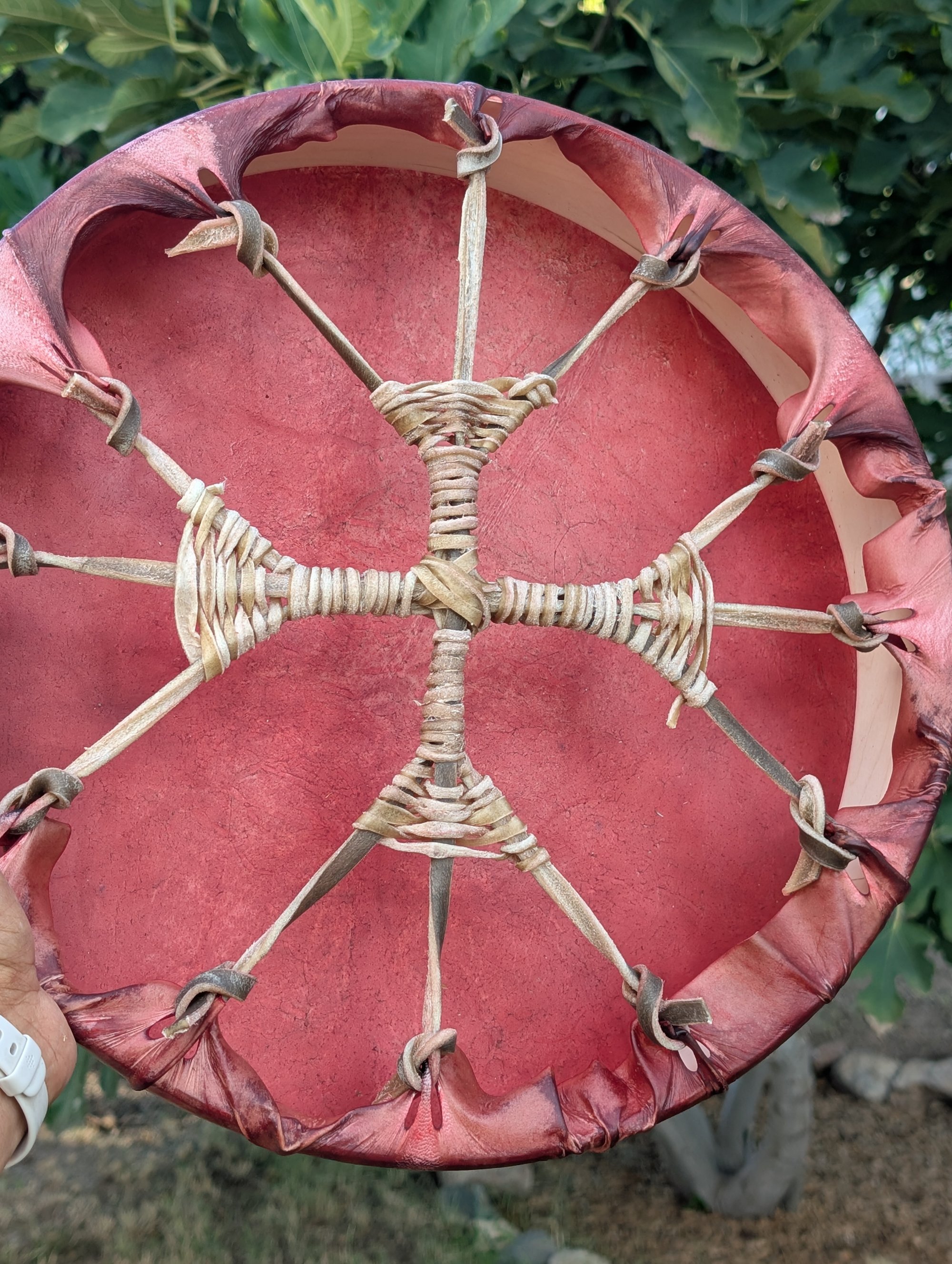 This 15" Frame Red Dyed Deer Drum is a 12 point, Multi-Strand drum. Great for travel as it's lighter and easy to hold for long periods.